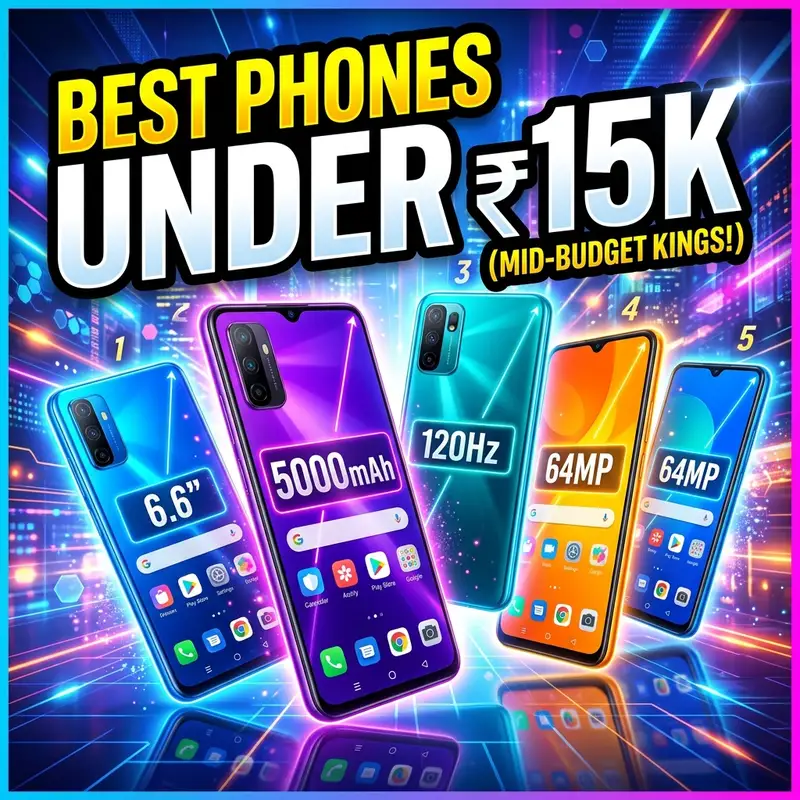 ₹15,000 के budget में India के best smartphones 2026 — AMOLED displays, 5G phones, और fast charging. Expert picks with full specs और buying guide.